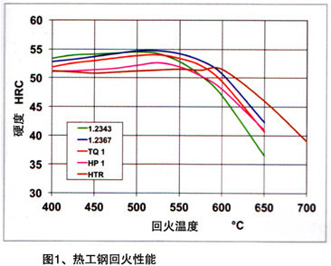 圖表不僅是壓鑄模具熱處理時一個重要的工作方法,而且也對熱工鋼正確選擇有幫助。這樣的圖表明的是由于加熱鋼的硬度變化。圖1,是所介紹鋼的回火曲線,在此曲線圖上,德國使用較少的1.2344鋼未列上去。除了HTR鋼,所列鋼種在500——550度之間回火溫度下表現(xiàn)有顯明的二次硬度最大值。隨著回火溫度繼續(xù)增加,硬度下降。由曲線下降坡度可以推斷回火穩(wěn)定性?;鼗鹎€下降越陡,鋼的回火穩(wěn)定性越小,在澆注作業(yè)中鋼的加熱反應(yīng)越敏感。與1.2343鋼相比,此曲線證明1.2367鋼有較好的回火穩(wěn)定性,在550度之上回火溫度技術(shù)范圍,TQ1和HP1達到幾乎與1.2367一樣的回火穩(wěn)定性。特種鋼HTR由于其高的鎢含量表現(xiàn)出較其余鋼明顯高的回火溫度。二次硬度最大值不僅在約70度時移至較高的回火溫度,在此最大值之上溫度時曲線也降得比較小。